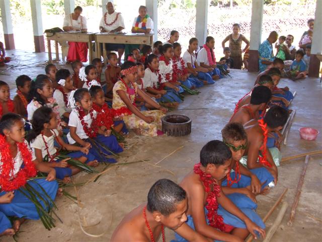 We went back to uncover the piglet and the taro, breadfruit and pulusami (coconut cream wrapped in taro leaves) from under the leaves. The chicken soup was also ready and myself and most of the other volunteers who had drawn food runner positions out of the bag took bowls of chicken soup, with the chicken feet sticking straight out of the bowl talons red and curled in protest, and a plate with pieces of the roast piglet, taro, breadfruit and pulusami. I was in the front of the line and had the best plate, one with two chicken talons, and the foot of the piglet and Leah having pulled “high chief” out of the bag was the first to be served. I quickly looked back at the plates Dana was carrying behind me and whispered urgently, here you go ahead and serve Leah first. The second person to be served was the faifeau, Alli’s dad. So he got the plate with all the feet on it, an extra good plate I was told.